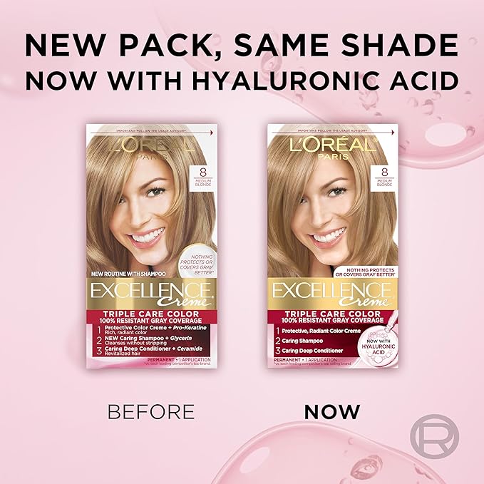 L'Oreal Paris Excellence Crème Permanent Hair Dye, Triple Care Hair Color with Pro-Keratine Complex for 100% Gray Hair Coverage, 8 Medium Blonde, 1 Kit