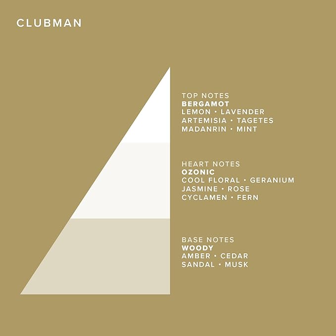 - CLUBMAN SCENT: Crisp and clean, Clubman is a fresh aromatic fragrance characterized by top notes of marzipan, bergamot, lemon, lavender, mandarin, and mint with a heart of patchouli, cinnamon, rose, orris, sandal, and carnation, resting on a base of moss, leather, amber, vanilla, musk, and tonka