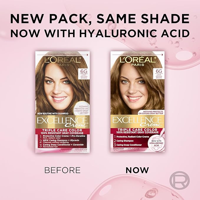 L'Oreal Paris Excellence Crème Permanent Hair Dye, Triple Care Hair Color with Pro-Keratine Complex for 100% Gray Hair Coverage, 6G Light Golden Brown, 1 Kit