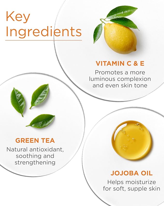 - Illuminating face wash: This gentle face cleanser removes dry skin cells for a more glowing complexion. With vitamin C, jojoba oil, & green tea to support skin vitality for a more luminous tone.