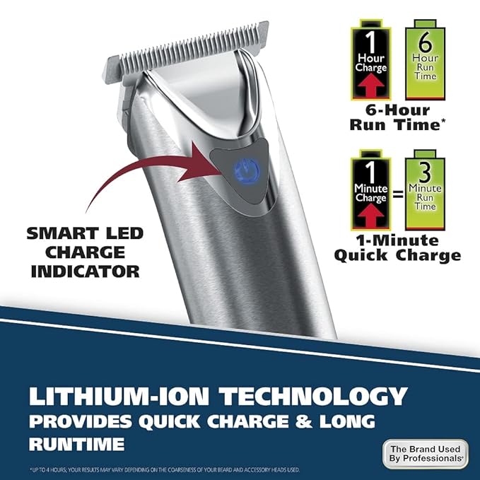 - Cordless Rechargeable - Beard trimmer for men is equipped with a long-running lithium-ion rechargeable battery that lasts up to 3.5 hours on a full 1-hour charge and has a 1-minute quick charge for 3 minutes of use.