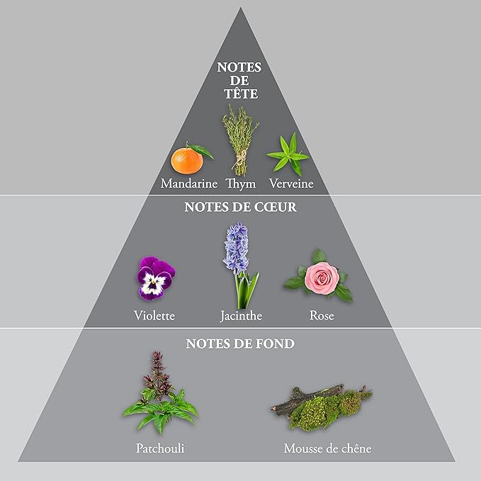 - Scent : Top notes: Verveine, Thym, Mandarine; Middle notes: Violette, Rose, Jacinthe; Base notes: Notes marines, Mousse, Patchouli Top notes: Verveine, Thym, Mandarine; Middle notes: Violette, Rose, Jacinthe; Base notes: Notes marines, Mousse, Patchouli