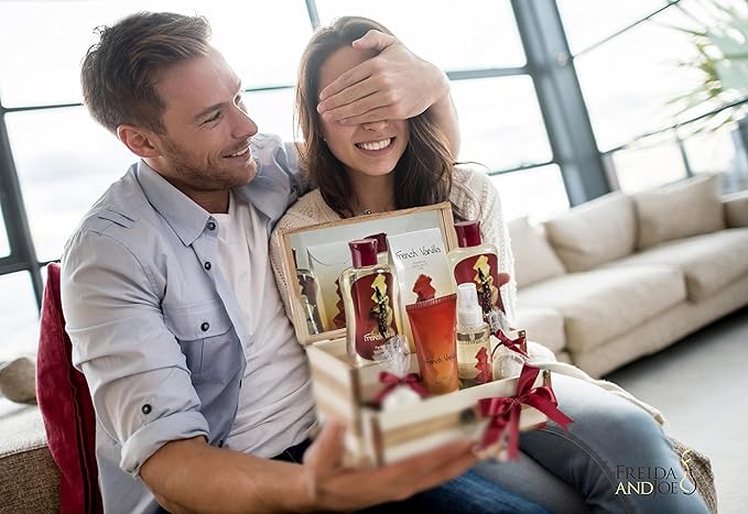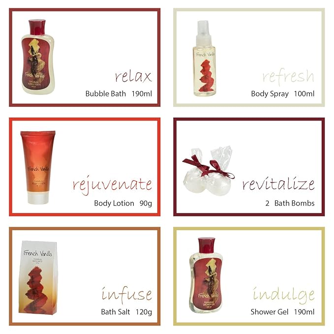 French Vanilla Bath Set Essential Bath and Body Basket: 2 Vanilla Bath Bombs, Body Lotion, Body Spray, Bath Salts, etc in a Wooden Jewelry Box