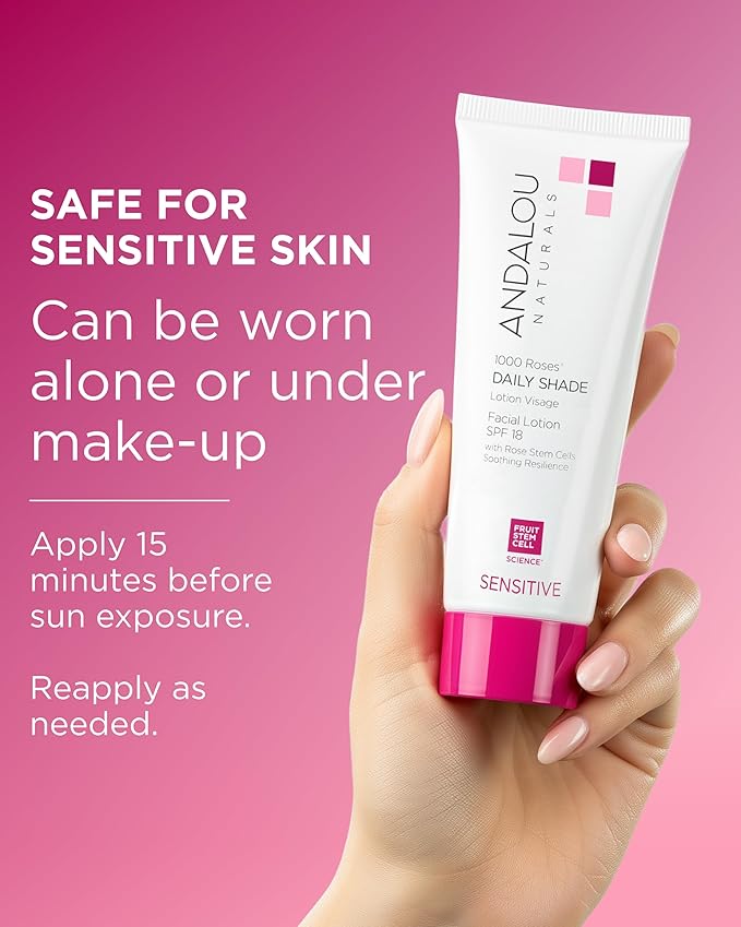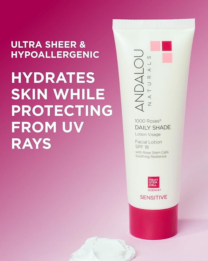 Andalou Naturals 1000 Roses Daily Shade Facial Lotion SPF 18 - 2-in-1 Skin Moisturizer & Face Sunscreen - Ultra Sheer & Hypoallergenic Skincare for Sensitive Skin - With Aloe Vera - 2.7 fl oz