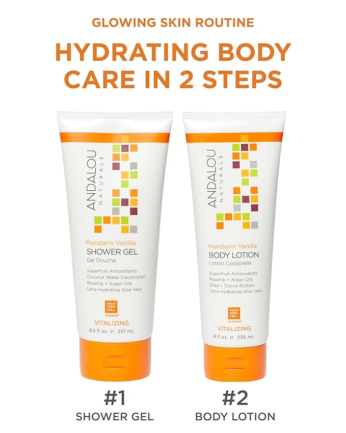Andalou Naturals Vitalizing Body Lotion Mandarin Vanilla - Hydrating Daily Moisturizer to Nourish Dry Skin - With Shea Butter, Cocoa Butter, Rose Hip Oil, Argan Oil, & Aloe Vera - 8 fl oz