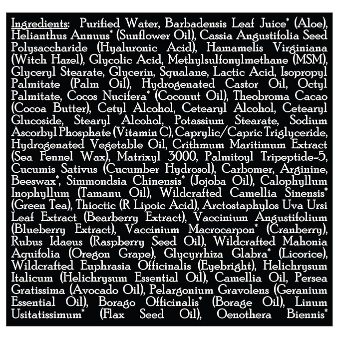 - Key Ingredients: Natural & Organic ingredients, including aloe, protein peptides, MSM, hyaluronic acid, vitamin C, and green tea.
