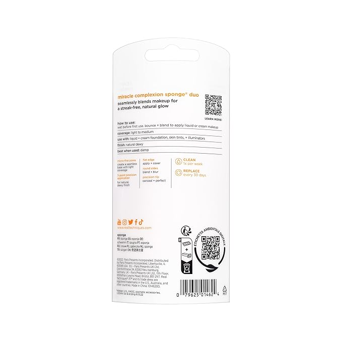 - Includes: (2) Real Techniques Miracle Complexion Sponges to seamlessly bounce and blend makeup for a streak-free, natural, dewy glow. Pack size for easy refills- don’t forget to replace your sponge every 30 days. Never run out by using Subscribe & Save