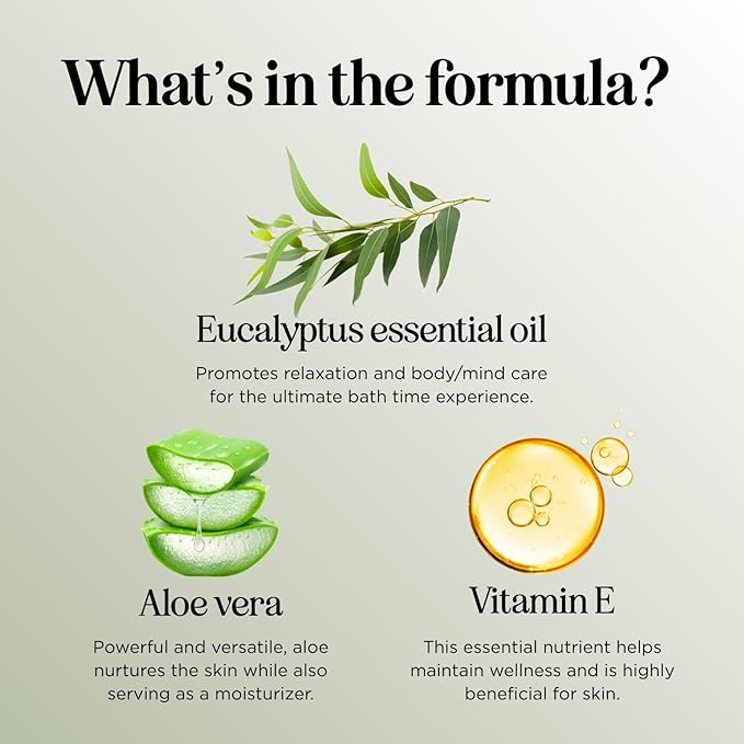 - Featuring Natural Oils - Our essential oil bubble bath formula made with chamomile aloe vera eucalyptus jojoba calendula and more transports both body and mind as you breathe in refreshing aromas