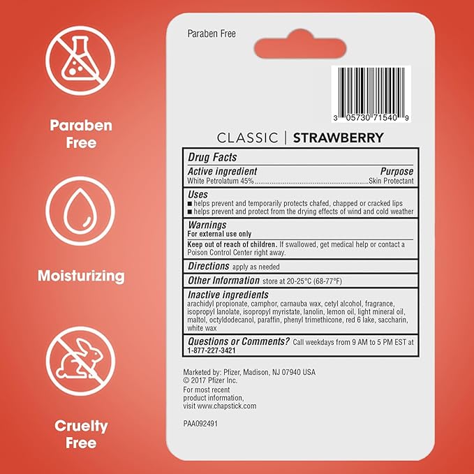 - CLASSIC STRAWBERRY CHAPSTICK: Stock up on Strawberry Chapstick. Each sheer-tinted lip balm is functional, portable, and flavorful.
