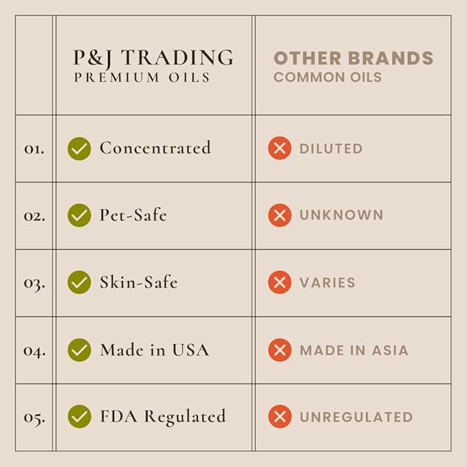 - PREMIUM GRADE: P&J fragrances oils are highly concentrated with a strong scent. With more than 30 years in the industry, these enhanced formulations were developed by our IFRA certified master perfumers. Our oils are safe and ideal for every home.
