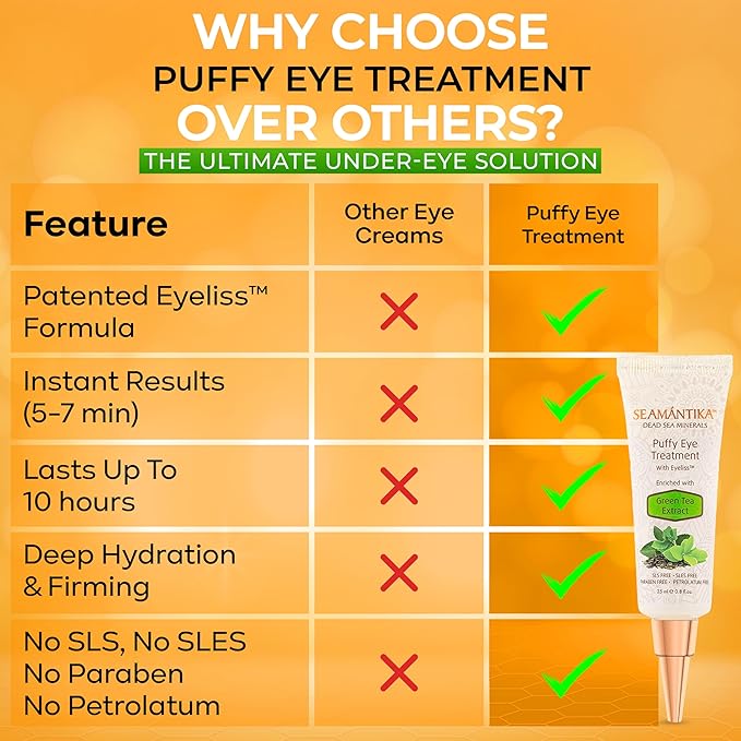 Puffy Eye Treatment Instant results – Naturally Eliminate Wrinkles, Puffiness, Dark Circle and Bags in Minutes – Hydrating Eye Cream w/ Green Tea Extract, Dead Sea Minerals by SEAMANTIKA – .8 fl.oz.