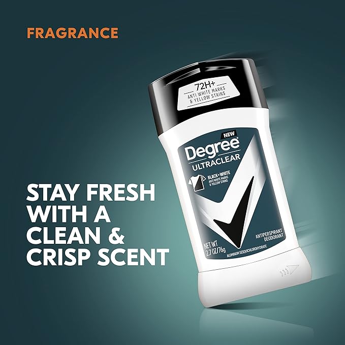 - WHITE SHIRT, BLACK SHIRT, NO PROBLEM: Degree UltraClear Black+White Antiperspirant Deodorant delivers 72-hour sweat and odor protection with anti-white marks and anti-yellow stains technology