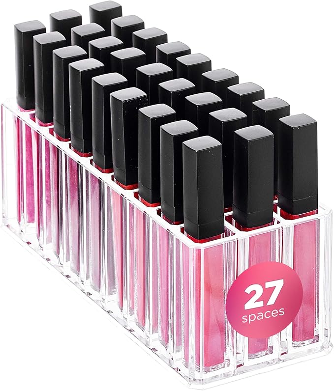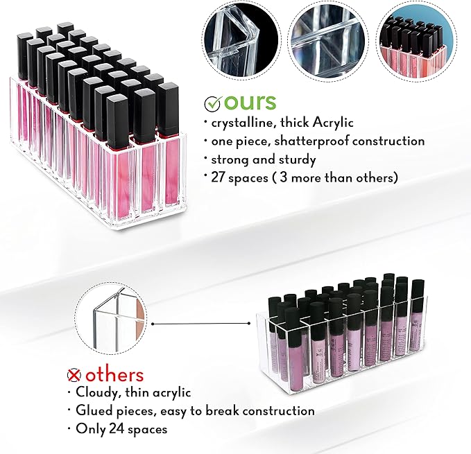 - 27 PERFECTLY SIZED COMPARTMENTS: Designed by a professional makeup artist, our makeup acrylic organizer has 27 compartments (3 more than competitors). Holds lip glosses, liquid lipticks, brushes, lip liners, eye pencils, mascaras, concealer tubes, highlighters, tubes of cream and more