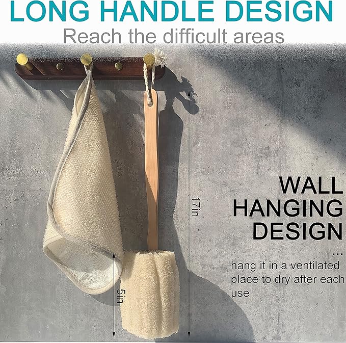 2 Pack Natural Exfoliating Loofah luffa loofa Bath Brush On a Stick - with Long Wooden Handle Back Brush for Men & Women - Shower Sponge Body Back Scrubber