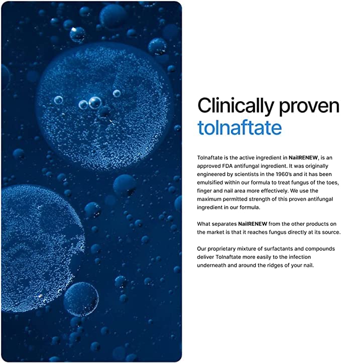 - Proven Tolnaftate: The active ingredient in NailRENEW, Tolnaftate, is a compliant antifungal combined with a blend of proprietary compounds and mild surfactants to help penetrate the nail and eliminate fungus so you can go barefoot with confidence!