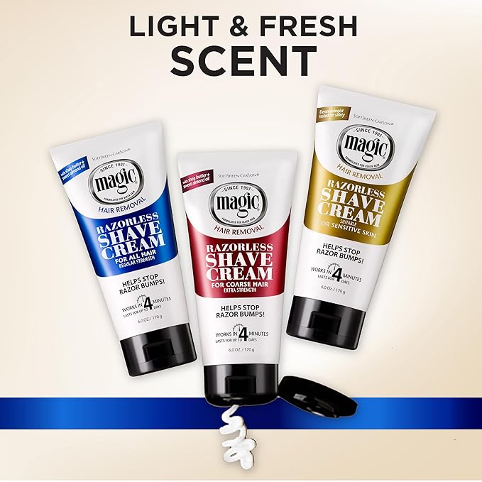 - For All Beard Types: Magic Razorless Cream Shave comes in 4 formulations: Regular Strength, Extra Strength, and Bald Head Maintenance, plus our classic powder formulation. No shaving with a razor!
