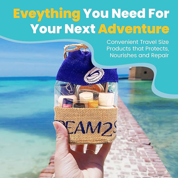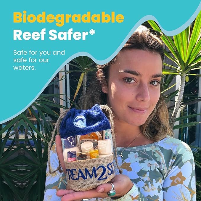 - REEF SAFE, BIODEGRADABLE TRAVEL SIZED GIFT SET - Our natural products are consciously formulated for use while camping and boating and is perfect for travel. Set Includes 1oz Travel Size Shampoo, Leave In Conditioner, SPF20 Sunscreen, SPF30 Tinted Mineral Sunscreen & Sting Relief Gel