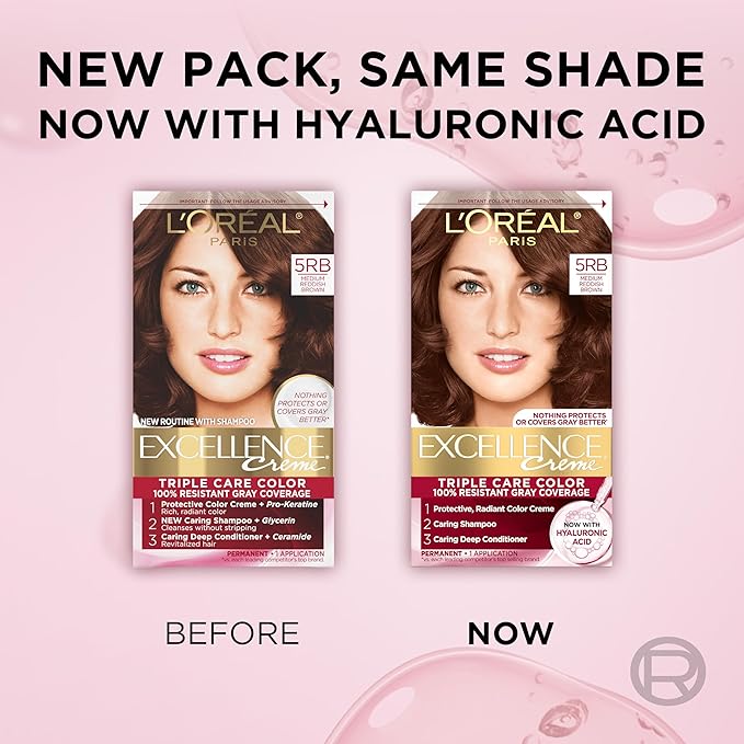 L'Oreal Paris Excellence Crème Permanent Hair Dye, Triple Care Hair Color with Pro-Keratine Complex for 100% Gray Hair Coverage, 5RB Medium Reddish Brown, 1 Kit (Pack of 2)