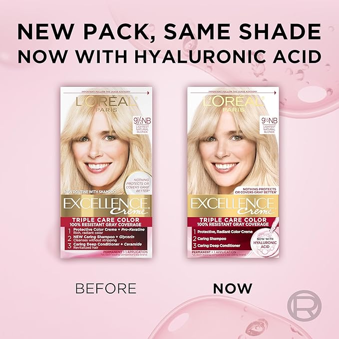 L'Oreal Paris Excellence Crème Permanent Hair Dye, Triple Care Hair Color with Pro-Keratine Complex for 100% Gray Hair Coverage, 9.5NB Lightest Natural Blonde, 1 Kit (Pack of 2)
