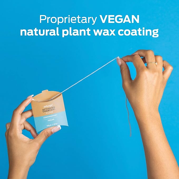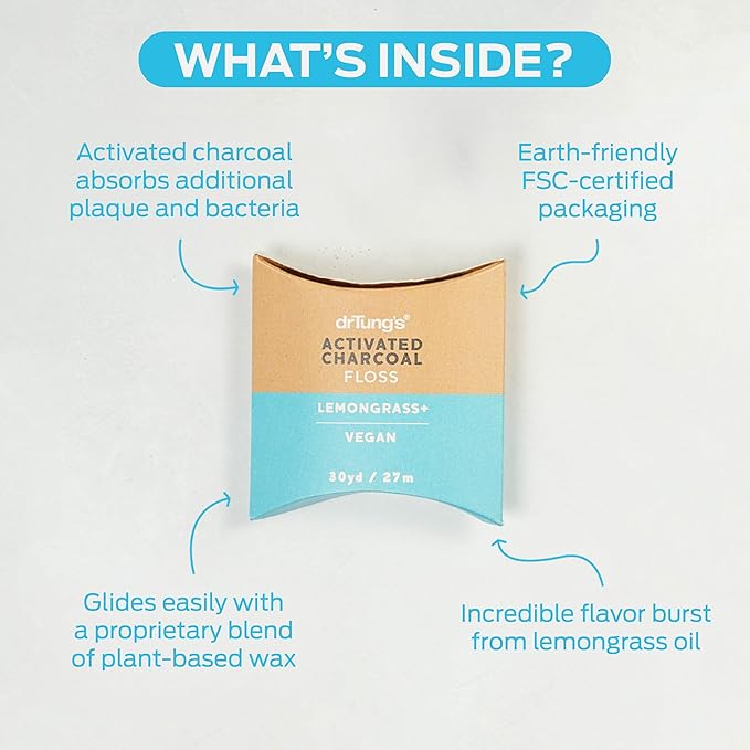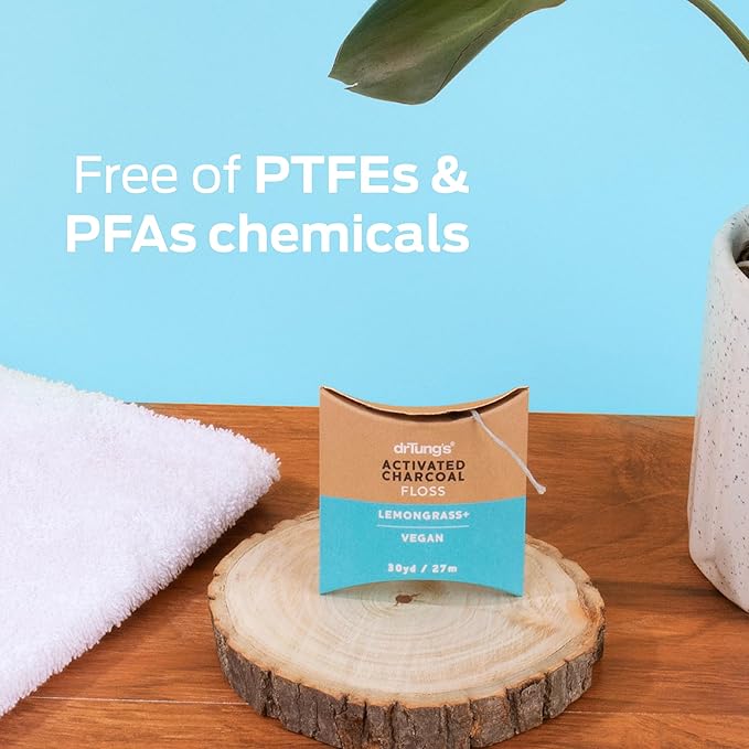 DrTung's Vegan Activated Charcoal Floss - Natural Dental Floss, PTFE & PFAS Free, Gentle on Gums, Expands & Stretches, BPA Free - Lemongrass Flavor (Pack of 2)