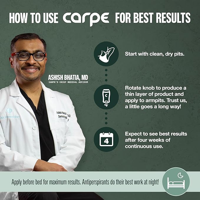 - CARPE UNDERARM LOTION DIRECTIONS- PLEASE READ: Apply every night before bed and again every morning. For maximum efficacy and best results, use consistently for 4 weeks. Consistency is key. Applying before bed is very important to achieving great results because you're sweating less at night, which allows the product to have the most effect.