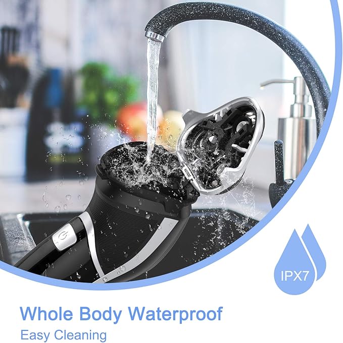 - IPX7 Waterproof Dry & Wet Shaving: the whole body of the rechargeable mens shavers is waterproof, you'll get a convenient dry shave or a refreshing wet shave with gel or foam, even in the shower; Clean the shaver with ease, at the touch of a button, flip open the shaver head and rinse with water; Note: we recommend you to replace the shaver head every 6 month for best shaving result