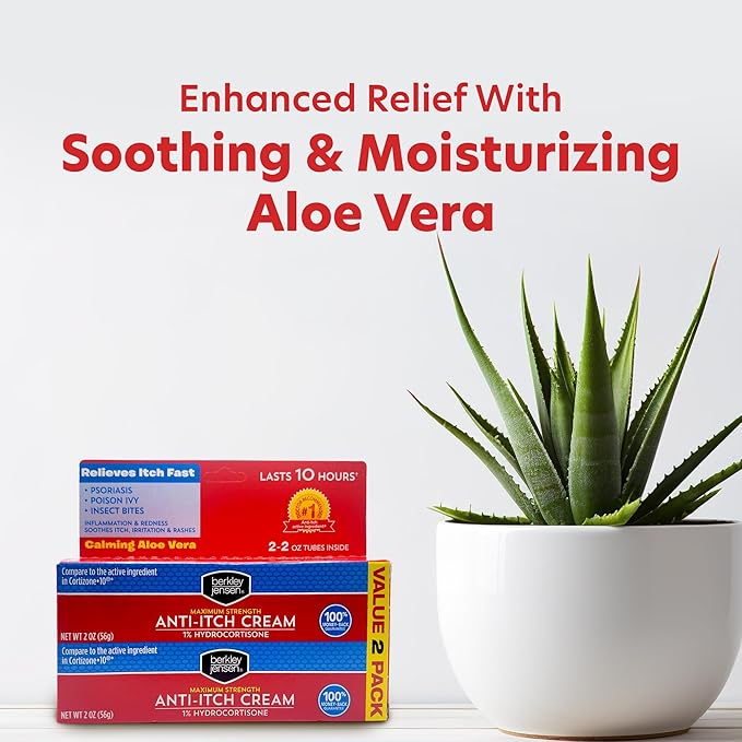 Berkley Jensen Maximum Strength Anti-Itch Cream (4 oz.), with Calming Aloe Vera, 1% Hydrocortisone Itch Relief for Eczema, Psoriasis, Bug Bites, Poison Ivy, Oak and Sumac, 2 oz. Tube (Pack of 2)