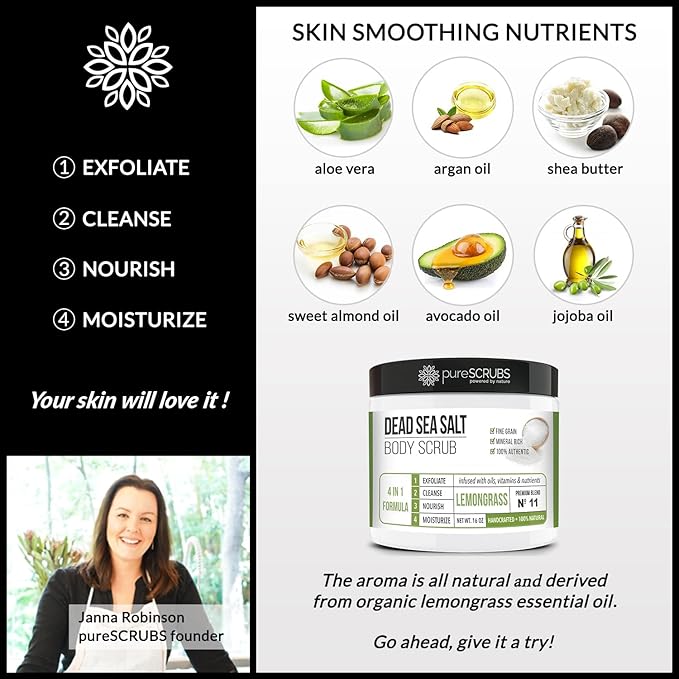 - GET ULTRA SMOOTH SKIN FAST - THIS WORKS! Our unique “4 in 1 Formula” does everything a body scrub should do and more - EXFOLIATE, CLEANSE, NOURISH & MOISTURIZE. Fine grain dead sea salt infused with essential oils, nutrients and skin softeners helps to smooth away rough, bumpy, and uneven textures to instantly reveal your true soft, healthy and radiant skin. You'll love the lemongrass aroma!