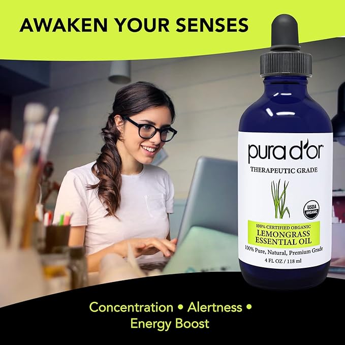 PURA D'OR Organic Lemongrass Essential Oil, 4oz, Therapeutic Grade, for Hair, Body, Skin, Aromatherapy, Relaxation, Massage, Vitality, Home, DIY Soap