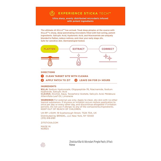 - EX-ZIT STRATEGY: With ZitSticka's signature microdart delivery system, we don't wait for the pimple to fully form. KILLA accesses the source of the zit, allowing its potent ingredients to take action in the 'upcoming' stage. This means we can swiftly curb the pimple's progress or bring it quickly to the surface, where it can be easily managed.