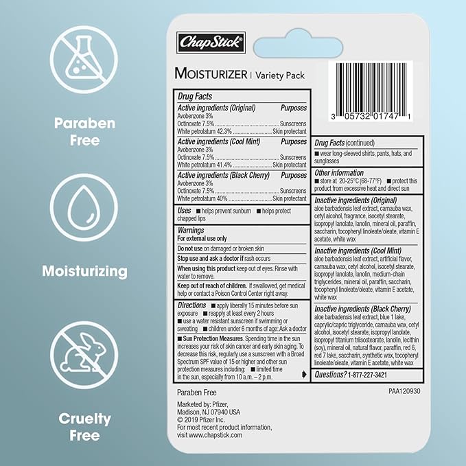 - LIP CARE WITH SUN PROTECTION: Keep your lips ultra-hydrated and protected from the sun’s rays. The ChapStick Moisturizer 2-in-1 Lipcare variety 3-pack includes Original, Black Cherry, and Cool Mint.