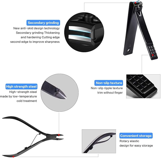 - ❤【Easy to Use, Non-slip Handle Design】ergonomic design, medical grade stainless steel, not easy to fall off. Very easy to trim hard and thick nails. Provides a comfortable and relaxing care life, easy to grasp and reduce fatigue. nail clippers set black manicure set fingernail cutters nail scissors