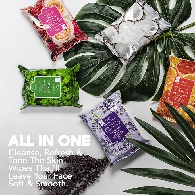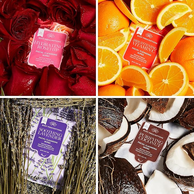 - Body Prescriptions face wipes - refreshing, cleansing, hydrating, brightening and purifying mint, rosehip, vitamin c, lavender and coconut daily face wash