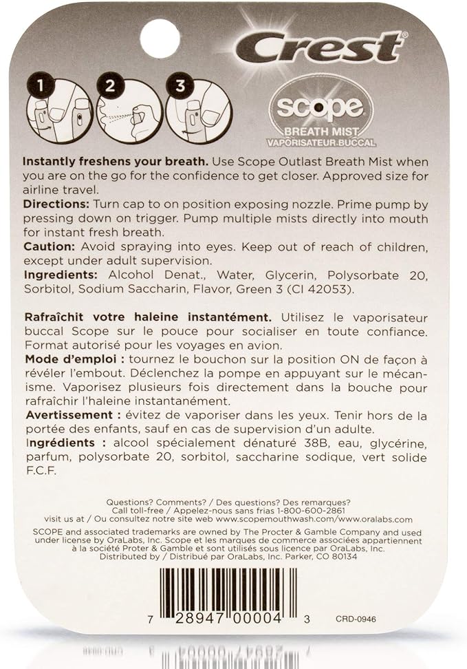 - LONG LASTING: Crest clean meets Scope freshness with this fat free, sugar free long lasting breath mist spray.