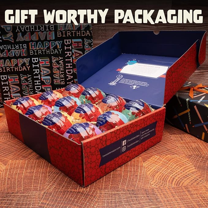 Superhero Boys Bath Bombs with Surprise Hero Toys Inside (12 Pack) - Large Bubble Bomb, Fruity Scents, Relaxing Aromas - Ideal Birthday Gift for Kids by Two Sisters