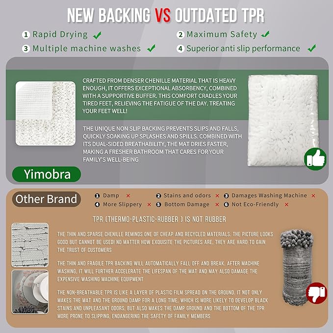 - Total Grip Safety & Quick Dry: Yimobra bath rug features a feather-light yet ultra-grippy hot-melt backing that stays firmly in place on wet surfaces. Its vertical air-channel chenille fibers ensure rapid and complete dryness, providing instant dry safety the moment you step out of the shower. The product is tested for harmful substances, performance, longevity, and emissions in accordance with the OEKO-TEX Standard 100