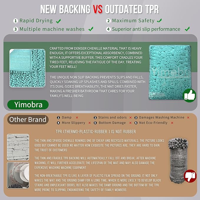 - Total Grip Safety & Quick Dry: Yimobra bath rug features a feather-light yet ultra-grippy hot-melt backing that stays firmly in place on wet surfaces. Its vertical air-channel chenille fibers ensure rapid and complete dryness, providing instant dry safety the moment you step out of the shower. The product is tested for harmful substances, performance, longevity, and emissions in accordance with the OEKO-TEX Standard 100