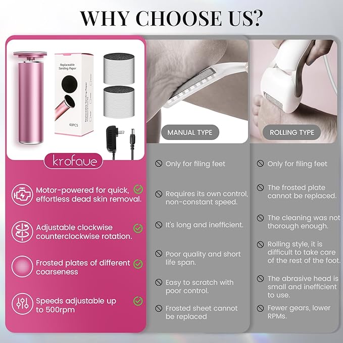 - 【Two Types of Sandpaper】: Electric Foot Callus Remover Can be rotated 360 degrees to remove cracked heels, dryness, dead skin and calluses. Gently does not hurt the skin.The set includes two types of sandpaper, you can choose according to your own situation, it is easier to remove dead skin!