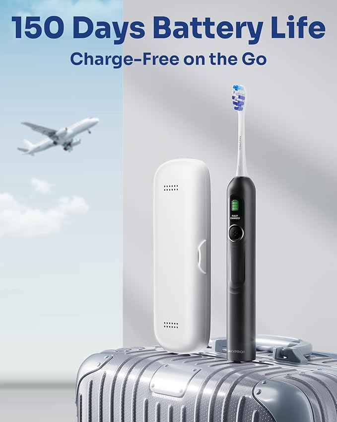 - 150 DAYS RECHARGEABLE BATTERY LIFE & TRAVEL CASE: This powerful electric toothbrush only requires 2.5 hours to fully charge and can last up to 150 days of use. The exquisite and portable travel case makes this electric toothbrush for adults great for travel and business trips, so you can always maintain good oral hygiene on the go.