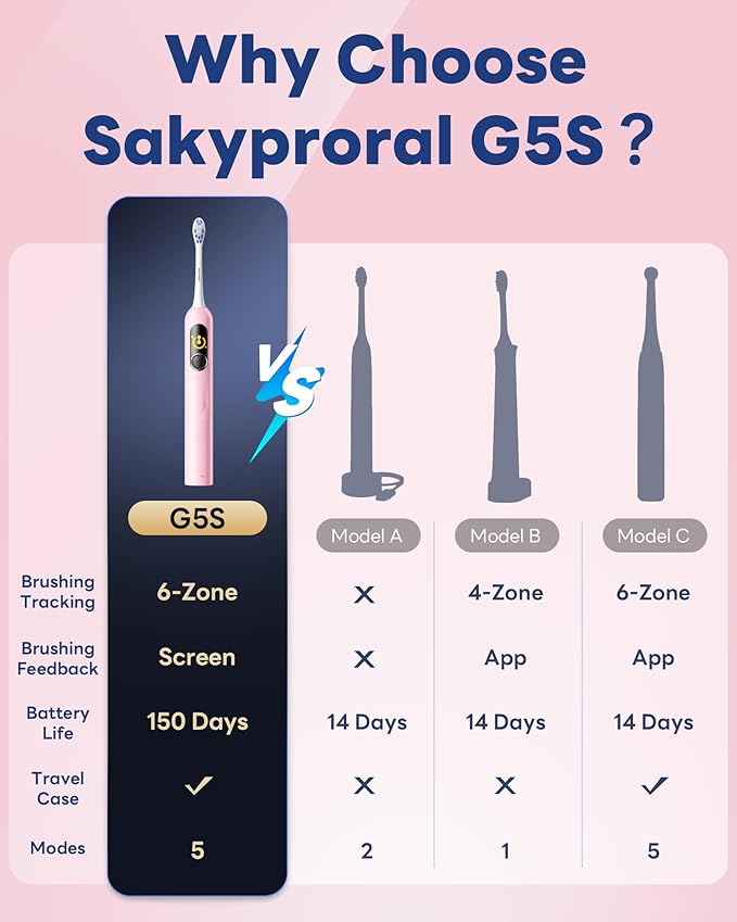 - VISUALIZED ORAL CLEANING: Never miss a spot with the G5S smart display that tracks 6 oral zones how and where you brush in real-time. Brush until 100% clean with soft to end ineffective brushing and maintain good oral hygiene.In user experience interviews with G5S owners of over 6 months, 10/10 reported a noticeable improvement in teeth cleanliness.
