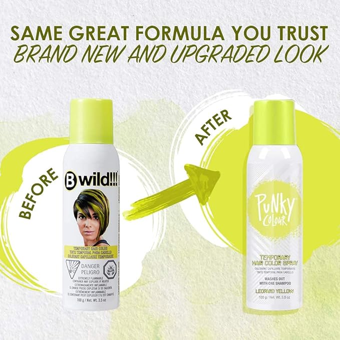 - Vibrant Spray-On Temporary Hair Color: Rawr like the tigress with leopard yellow hair without commitment! Amp up your style with a bright yellow hue that easily washes out in one shampoo. Can be used for all-over color or to create accent streaks.