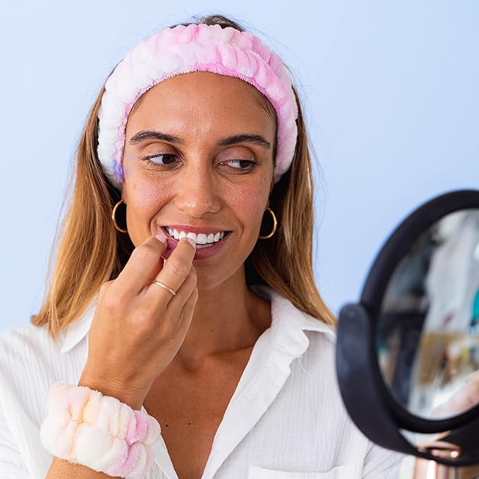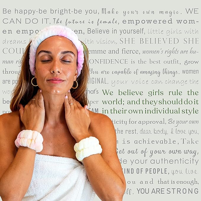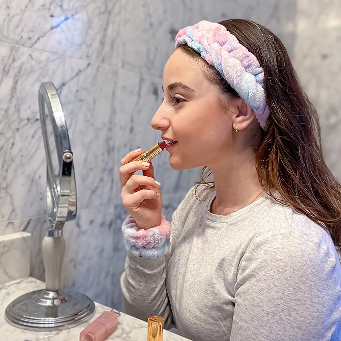- Unlike other face wash headband styles, this fluffy face washing headband includes two matching tie dye wristbands that prevents water from running down your arms