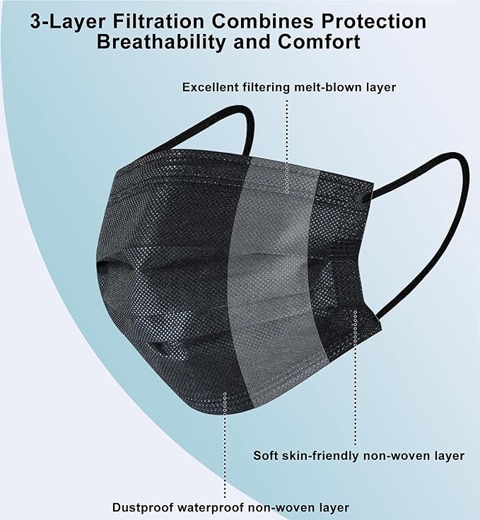 akgk 200pcs Disposable Face Masks, Black Mask, 3 Ply Disposable Masks