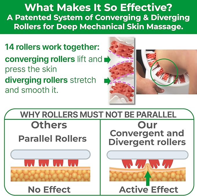 - ๐ฌ International patented triple-action system: Unlike many look-alike cellulite removers with simple parallel rollers that barely affect the skin, this device features a unique system of converging rollers that lift and firmly squeeze the skin, followed by diverging rollers that stretch and smooth it. If the rollers were parallel, they would have little or no real effect.