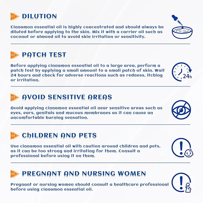 - NOTE: Cinnamon bark essential oil is very strong and should not be consumed directly, we recommend always diluting it with a carrier oil when applying it to the skin and testing it on feet first.