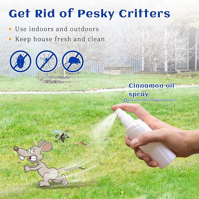 - REPEL ANIMALS - Many animals don't like the smell of cinnamon oil essential, dilute 5 to 6 drops of cinnamon bark oil in 100ml of water and spray on the kitchen, windows and garden to keep them away.
