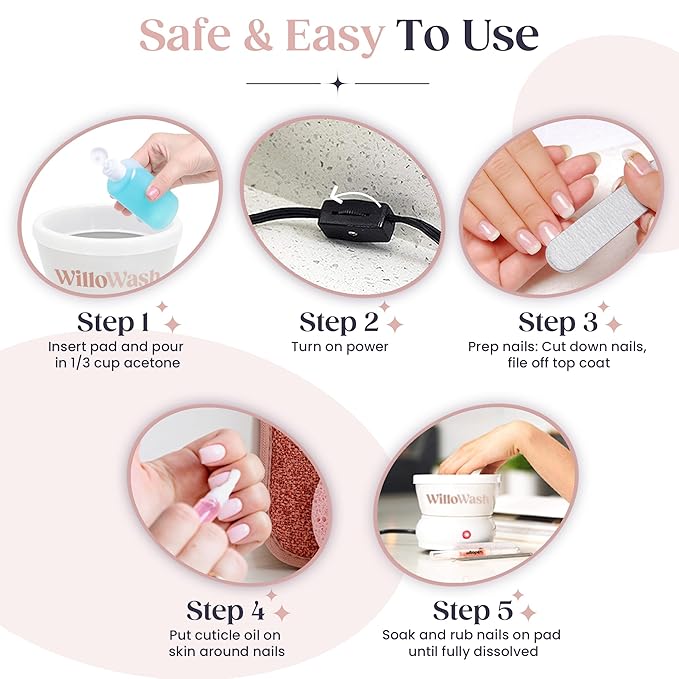 - Easy-to-use system: Simply power on the nail soak bowl & heat acetone for 5–10 minutes. File top coat, then soak nails in the acetone solution while rubbing against the pad for smooth, salon-quality acrylic & dip powder removal.