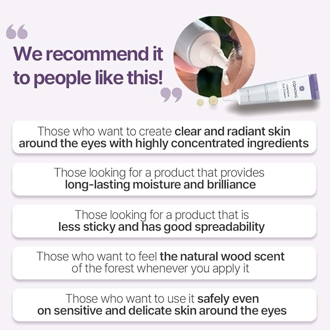 - [Features] *Care from sensitive and delicate eyes to the entire face & neck at once. * A total of 83 highly concentrated ingredients make the skin around the eyes glossy and vital. In particular, CQMONG Intensive Eye Cream, which focuses on wrinkles, is recommended to apply not only around the eyes, but also the forehead and nasolabial folds, and the entire face & neck area. * No stickiness and soft application, Good to use right before makeup / Long persistence of moisture * Natural Wood Scent (No artificial scent & color) → Good for Healing ! (like in the forest)