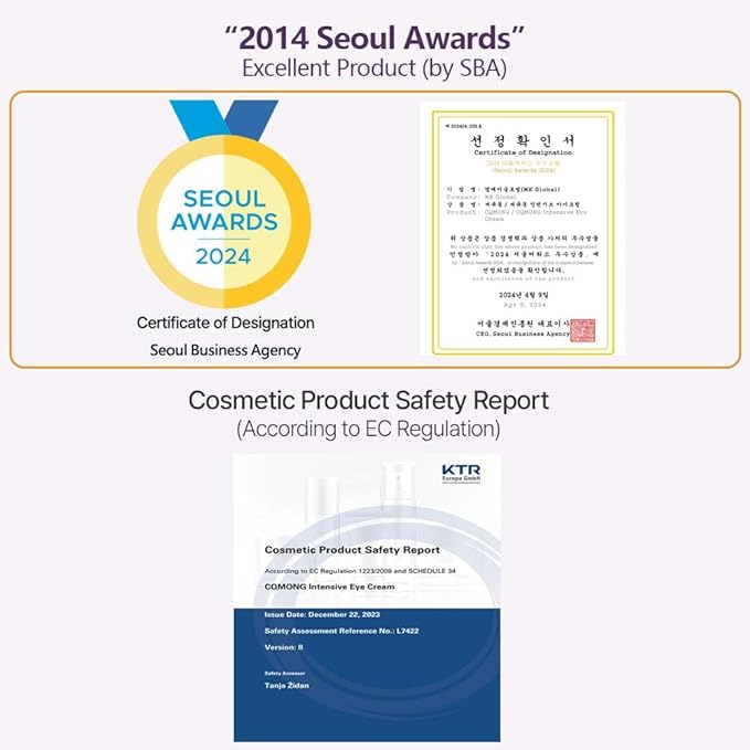 - [Safety] Eye Cream for daily use, safe for sensitive and delicate skin with mild and good ingredients → Exclusion of harmful Ingredients : Not including animal, harmful ingredients and surfactants, etc.(Paraben, Formaldehyde, Sulfate, Oil, Surfactants, Artifical Fragrance & Color, Cruelty Free) * Produced by the largest cosmetics manufacturer (With ISO & CGMP Certification) * Completed MoCRA Registration * Cosmetic Product Safety Report according to EC Regulation (Safety Assessment Reference No. : L7422) * “2024 Seoul Awards” : Excellent Product (by SBA in Korea)