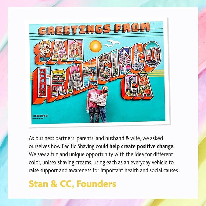 - Shave with Purpose - As business partners, parents, and husband & wife, we asked ourselves how Pacific Shaving could help create positive change beyond just superb shaving cream for men. We saw a fun and unique opportunity with the idea for different color unisex shaving cream women and men would love. Oh, and did we mention they make great sensitive skin shaving cream?